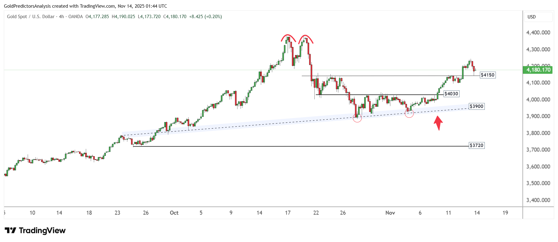 The 4-hour chart for spot gold shows a strongly bullish price structure, with a rebound from the black dotted trend line near the $3,900 region. This rebound followed the formation of a triple bottom pattern around $3,900 and a breakout above the $4,150 level.