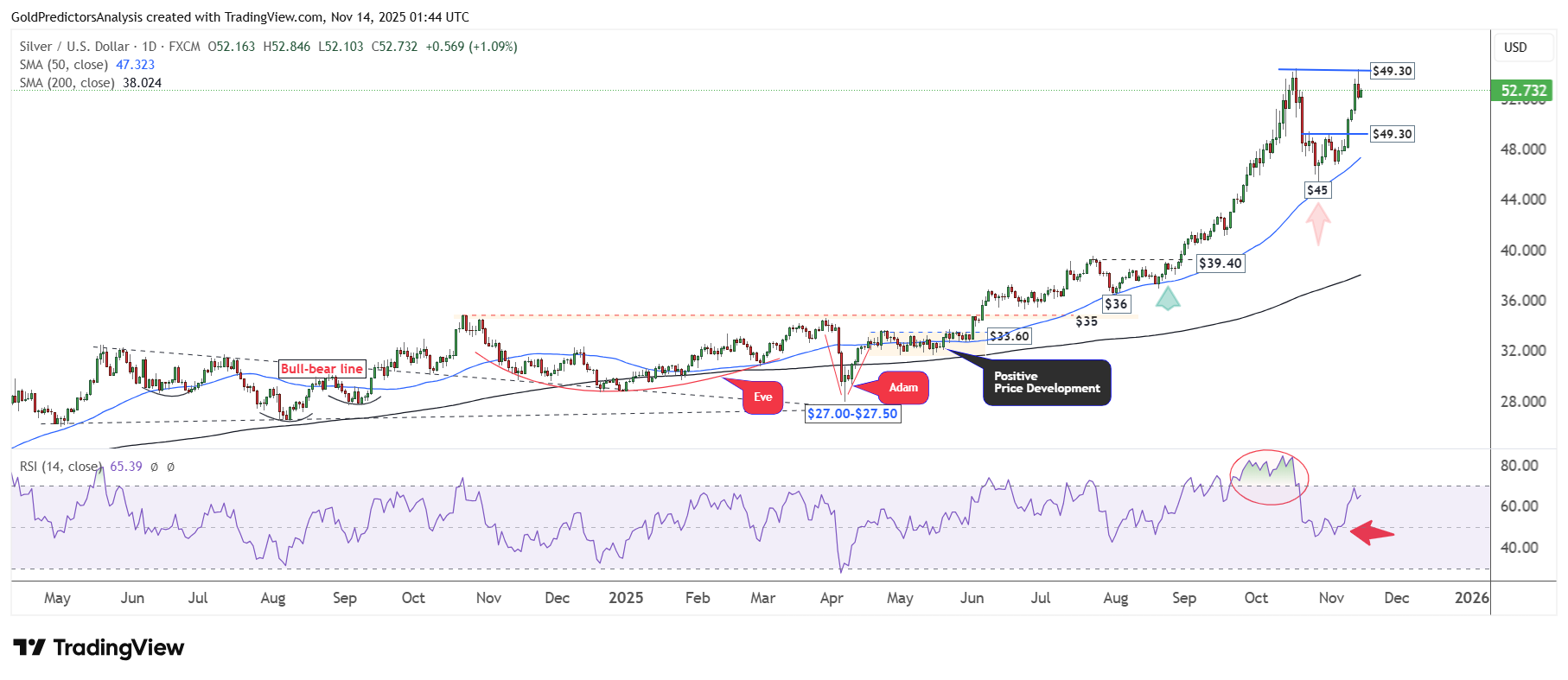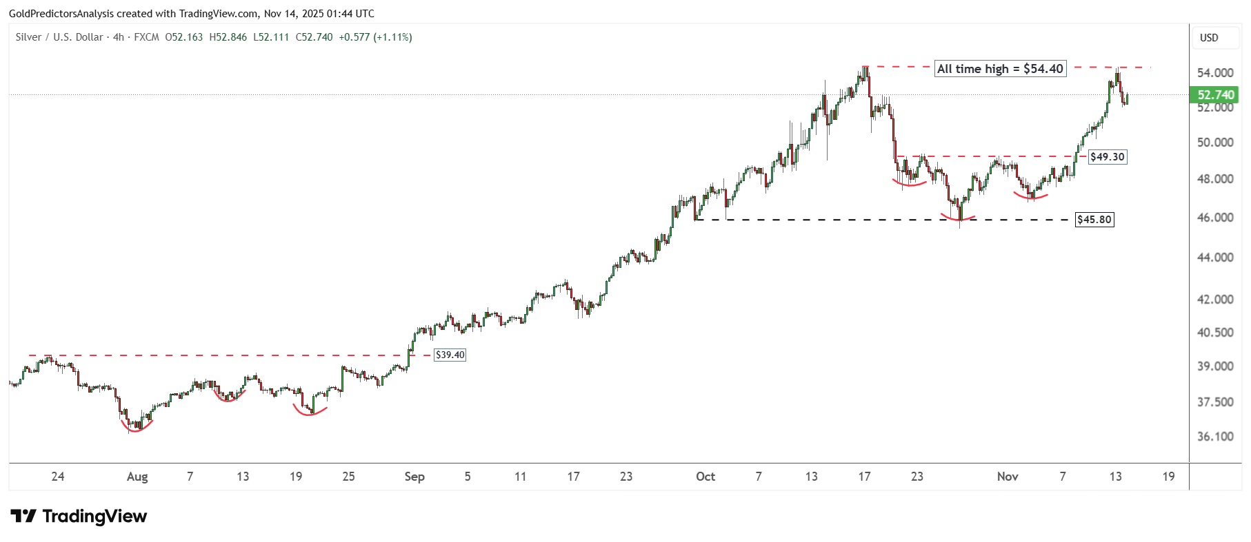 The daily chart for spot silver (XAG) shows that the price formed a bottom at the $45 support, aligned with the 50-day SMA, and then broke above the $49.30 level. After this breakout, the price reached its all-time high near $54.40 and is now consolidating while searching for direction.