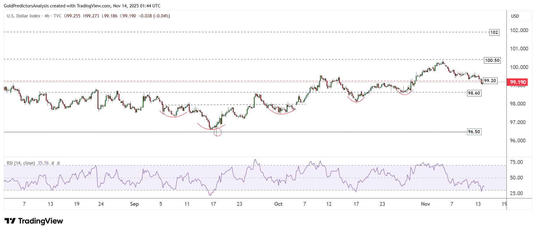 The 4-hour chart for the US dollar index shows strong consolidation between 96.50 and 100.50. After reaching the upper boundary at 100.50, the index is now attempting to move lower toward 98.60. A break below 98.60 would signal bearish price action and could lead to a further decline toward the 96.50 level.