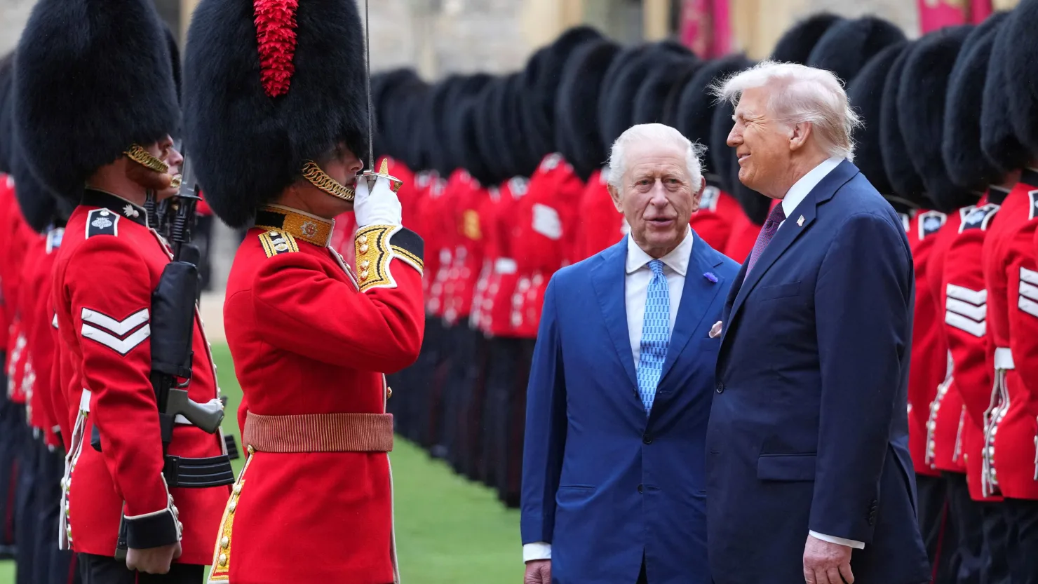 President Donald Trump and Britain's King Charles III review the Guard of Honour after the arrival at Windsor Castle in Windsor, England, Wednesday, Sept. 17, 2025.