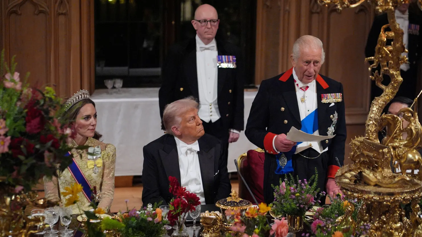 King Charles delivers his speech as U.S. President Donald Trump and Catherine, Princess of Wales listen during the state banquet for the US President and First Lady Melania Trump at Windsor Castle, Berkshire, on day one of their second state visit to the UK, Wednesday Sept. 17, 2025.