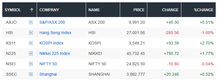 Overnight, the S&P 500 inched up 0.06%, while the Dow Jones Industrial Average climbed more than 78 points, or nearly 0.2%. The Nasdaq Composite rose about 0.4%, powered by a 0.9% gain in Nvidia that propelled the chipmaker to an all-time high. Other chipmakers also gained ground, with Intel and AMD each rising more than 3%.
