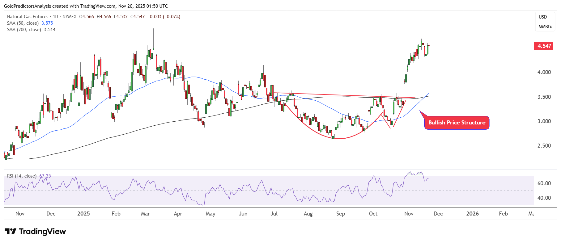 Another daily chart for natural gas shows strong bullish price action forming through a rounding bottom pattern below the $3.50 region. As the price broke above $3.50 and the 200-day SMA, momentum has strengthened. The 50-day SMA is now crossing above the 200-day SMA, confirming a strong resurgence in natural gas prices.