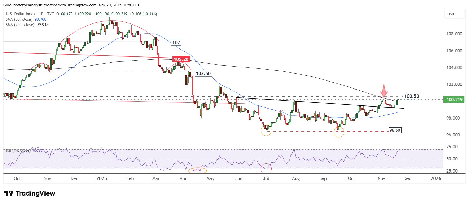 The 4-hour chart for the U.S. Dollar Index shows strong consolidation between the 96.50 and 100.50 levels. A breakout above or below this range will likely determine the next significant move.